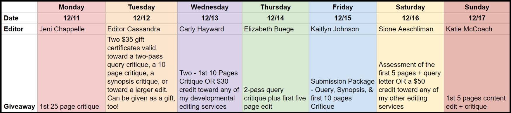 Each editor has taken over an entire day. They will be tweeting advice, discussing books, and possibly even playing some gif games. And of course, on top of that our generous editors are giving away awesome prizes!